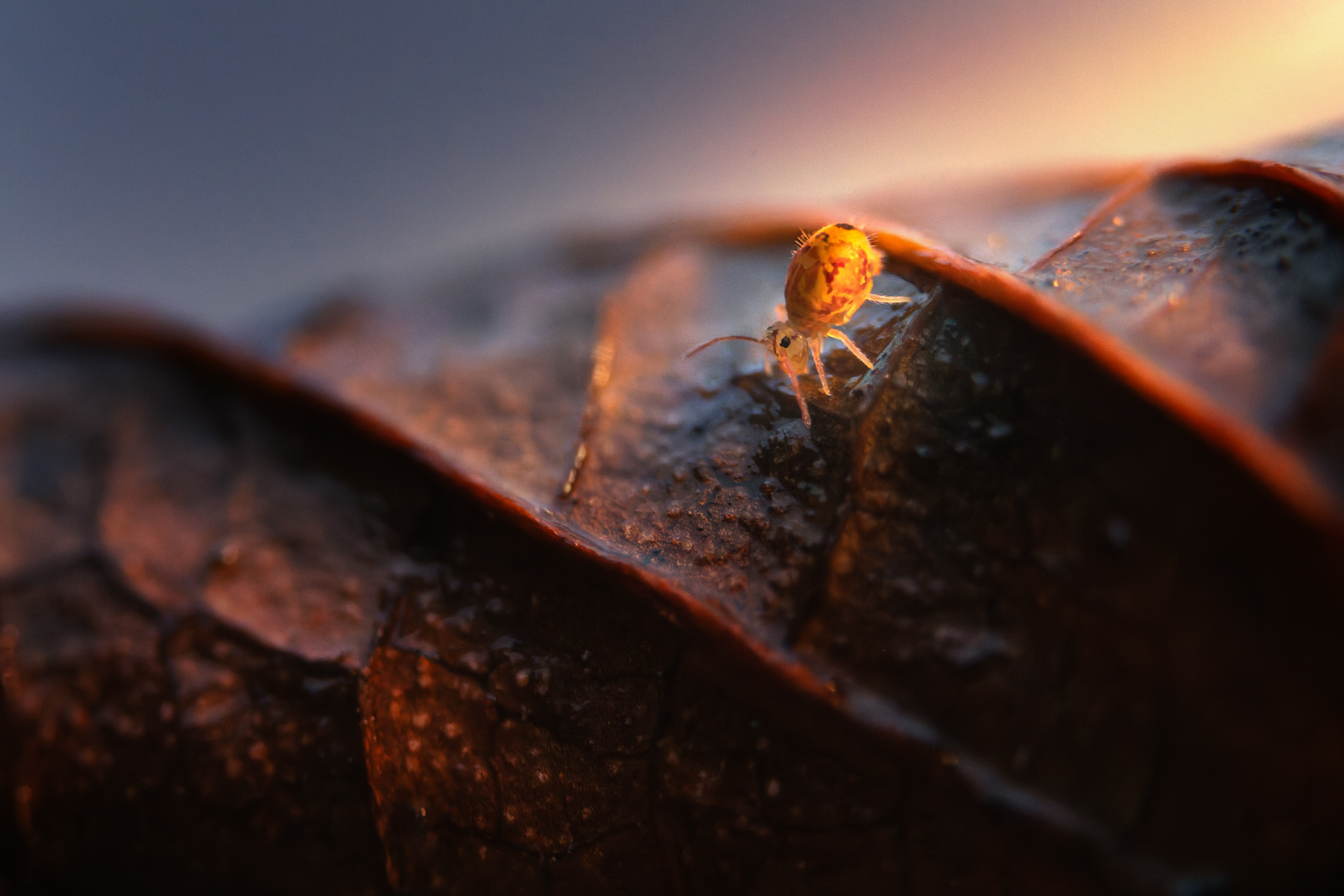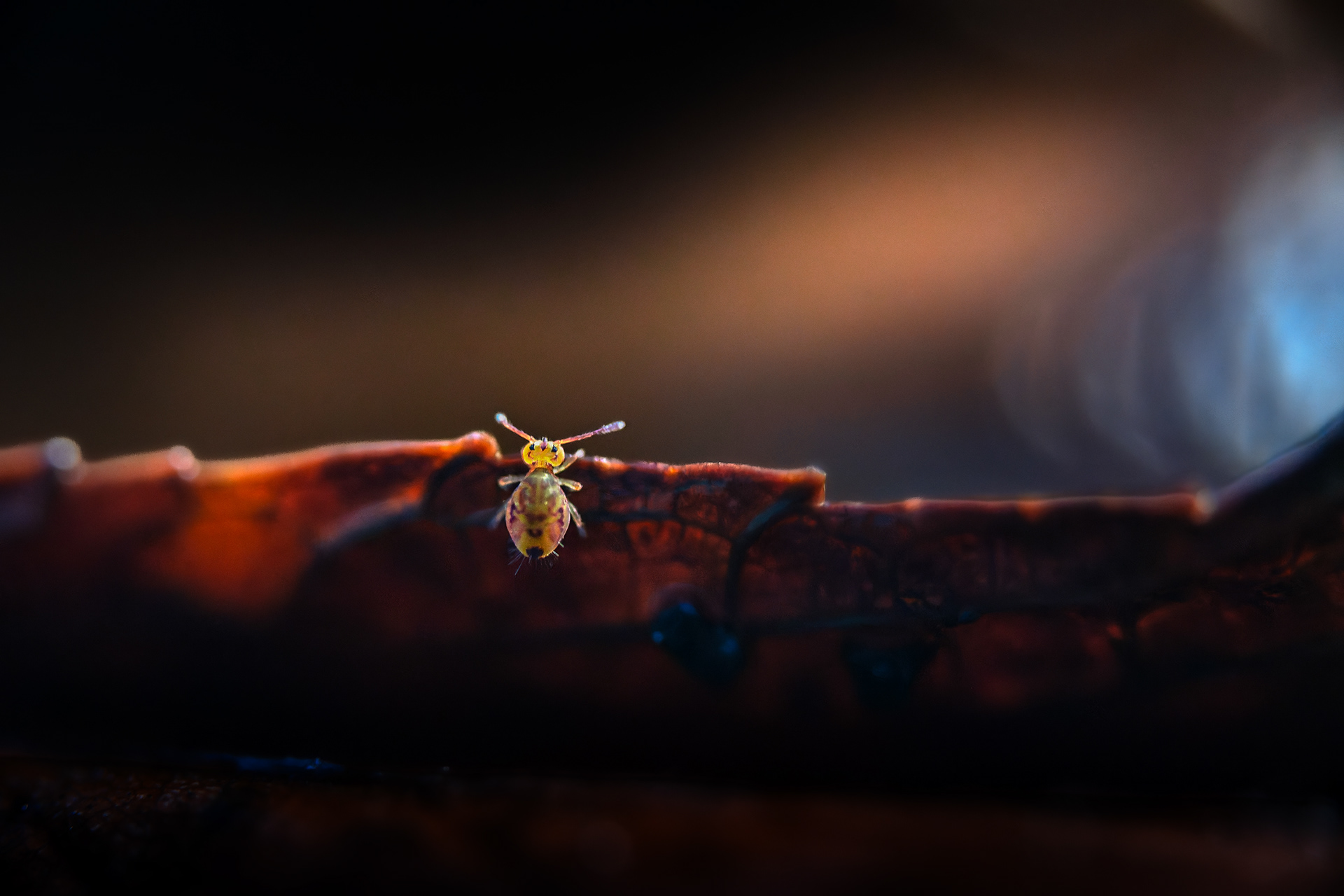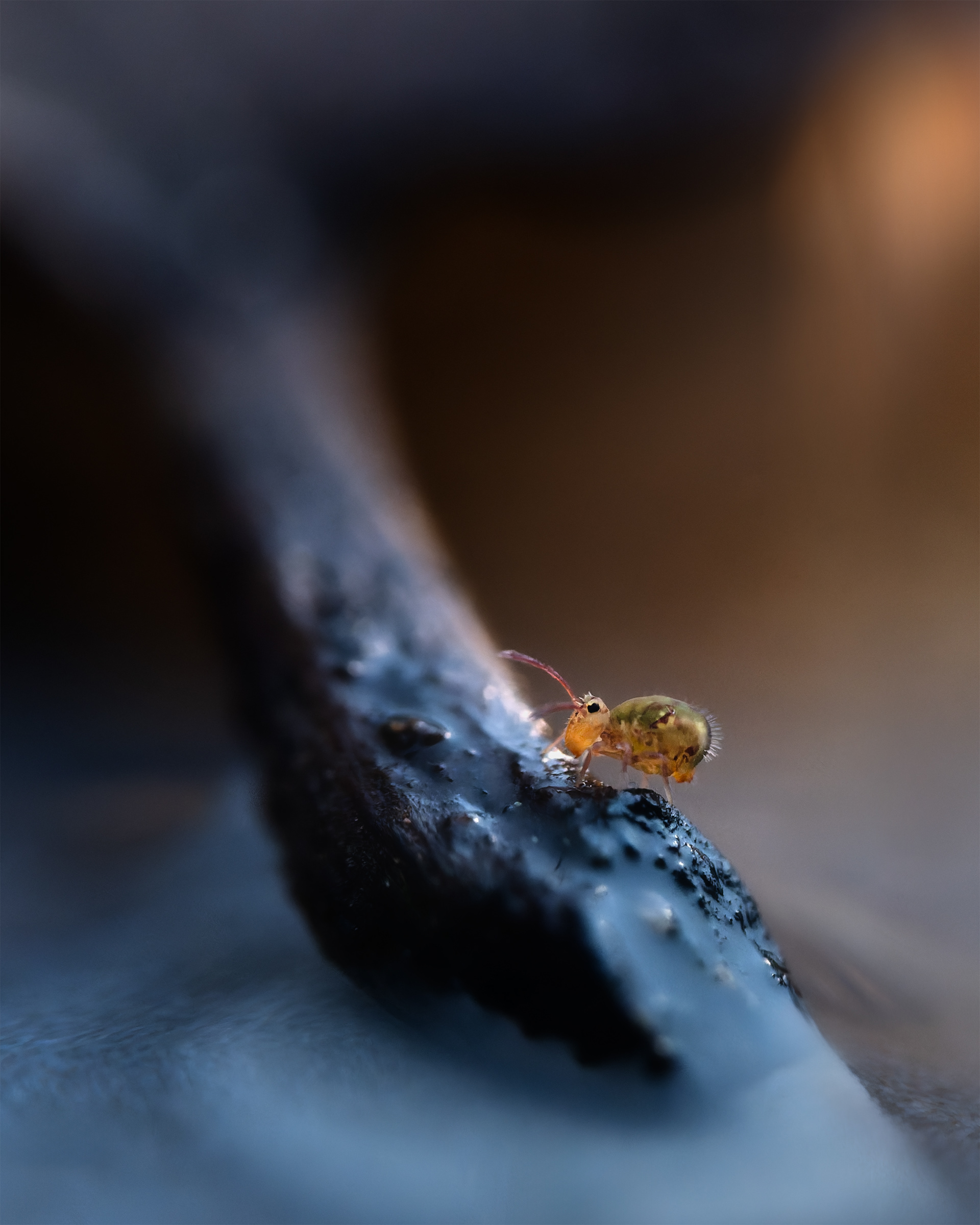 Photographing springtails is a demanding process. With a body size of roughly 1 millimeter and an unpredictable jump when disturbed, capturing them requires patience and precision. Their jump is powered by a spring-loaded appendage tucked beneath their bodies, known as the furcula, which can launch them out of view in an instant.